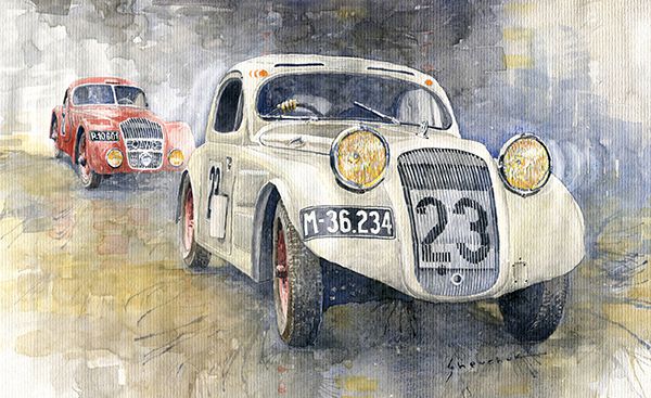 1935 Skoda Rapid Six Coupe Jawa 750 Coupe 1000 mil ceskoslovenskychWatercolour on paper